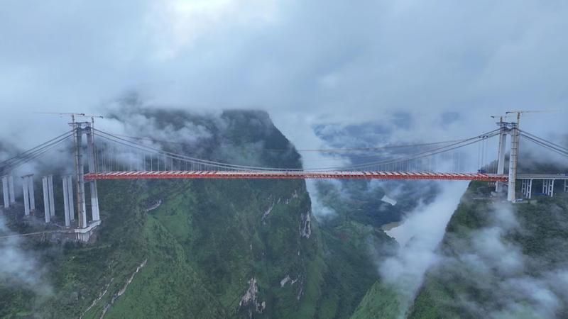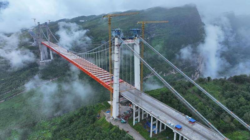 9月23日,由中铁广州工程局集团承建的安盘高速APTJ-6标天门特大桥,完成最后一节长13.6米钢桁梁的吊装合龙作业。这座横跨北盘江、桥面距江面560米的“空中巨龙”,不仅是峡谷地区世界第三高桥,更是全球最高的双向6车道钢桁梁悬索桥,其合龙标志着安盘高速建设迈入关键冲刺阶段。