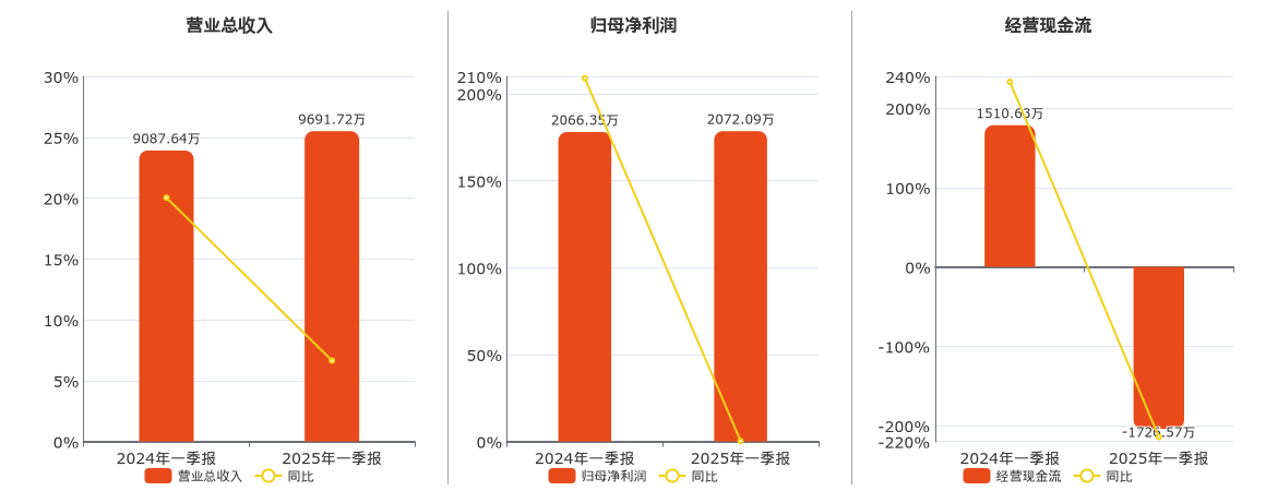 公司营业总收入为9691.72万元。归母净利润为2072.09万元。经营活动现金净流入为-1726.57万元,较去年同报告期经营活动现金净流入减少3237.21万元,同比较去年同期下降214.29%。
